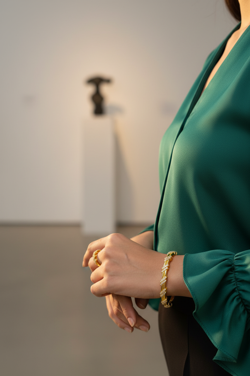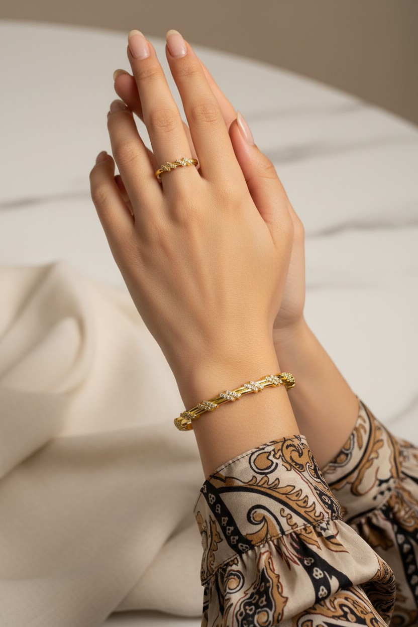 Contemporary Zig-Zag Pave Gold Bangle & Stackable Ring Set