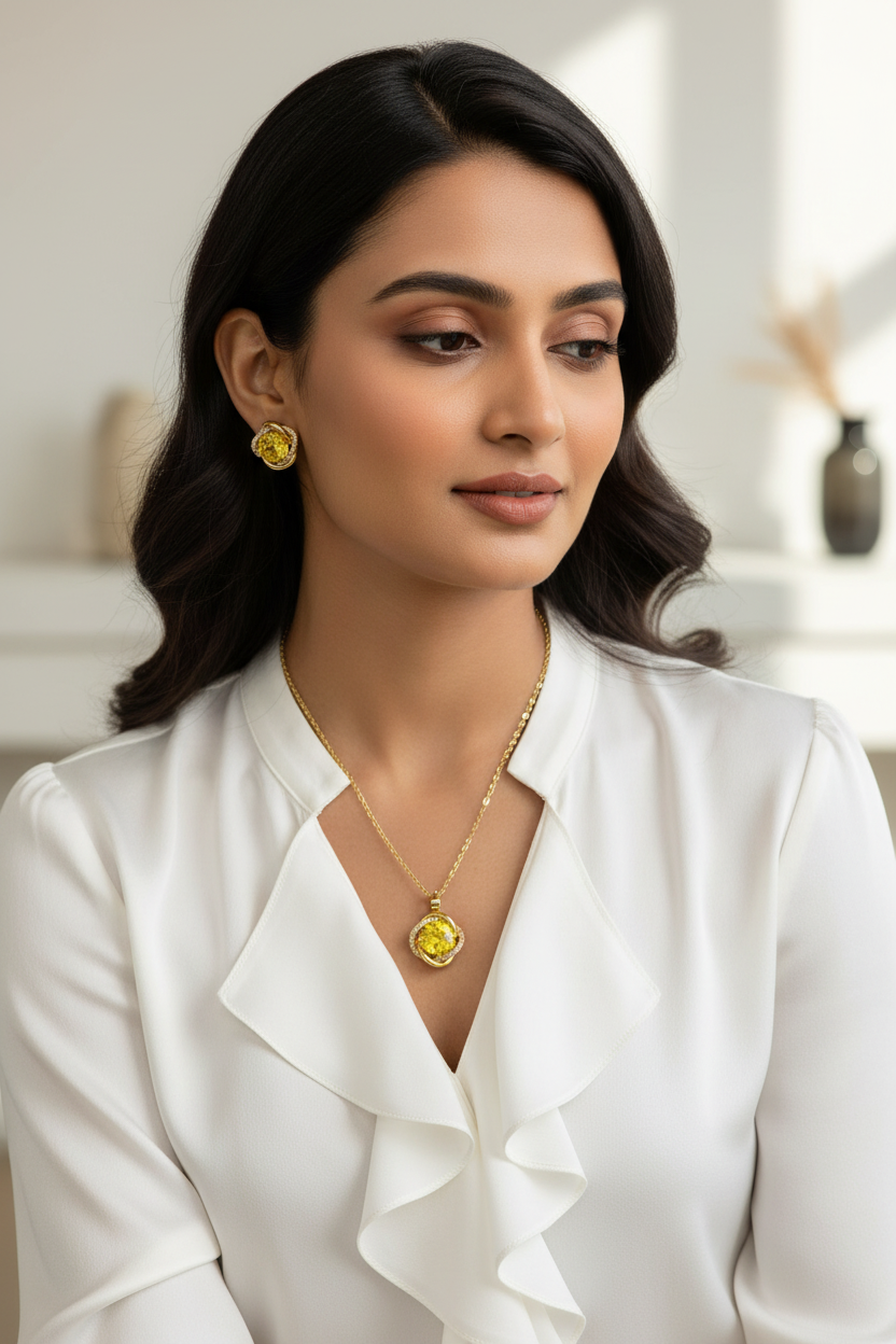 Radiant Citrine Yellow Round-Cut Crystal Pendant Necklace and Stud Earring Set/Fashion Jewelry" Gold-Tone Twisted Halo Yellow Zirconia Set