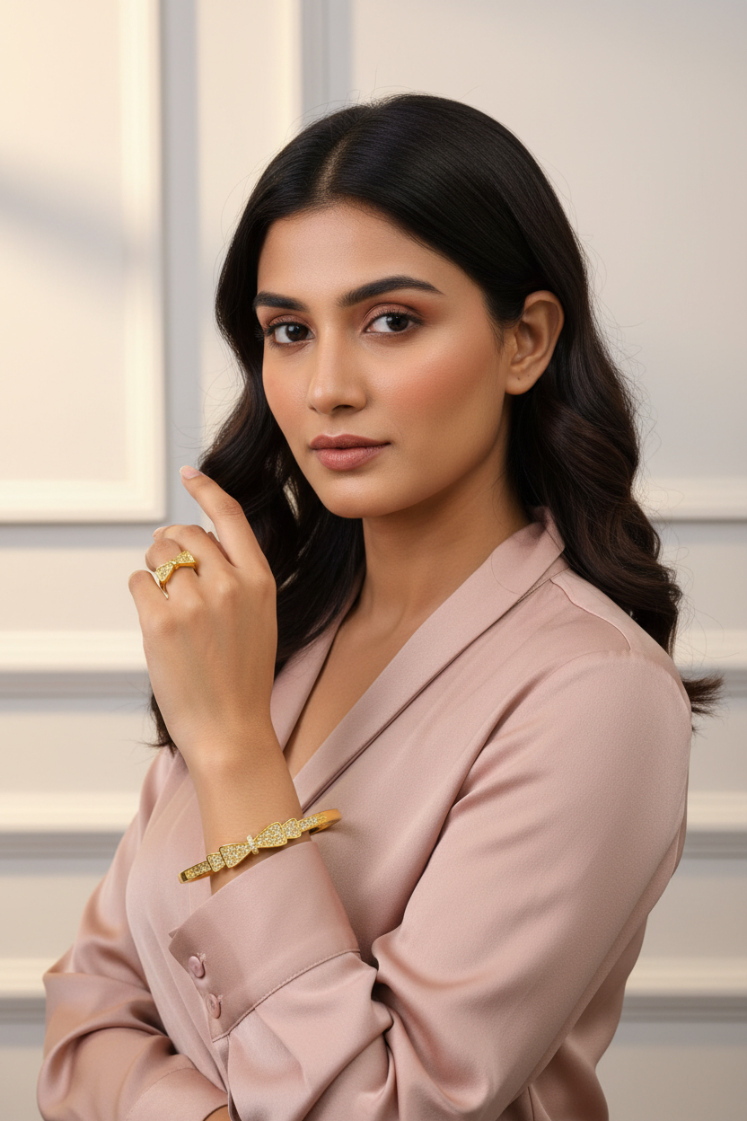 Sparkling Pave-Set Bowknot Gold Bangle and Matching Ring Set