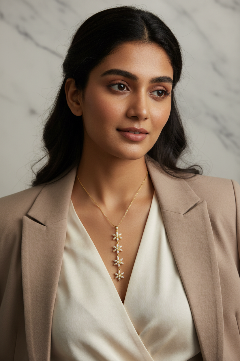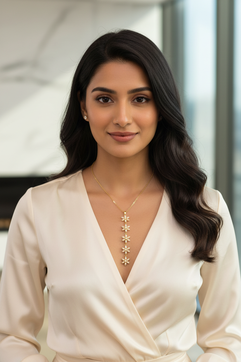 Elegant Five-Tier Floral Pearl Drop Necklace in Gold Finish/Inspired Daisy Pearl Pendant Necklace—Stainless Steel