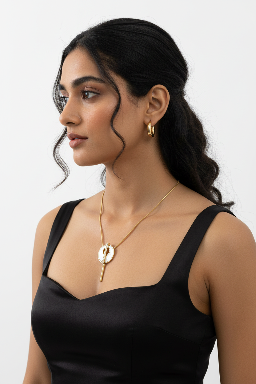Modern Minimalism Meets Celestial Sparkle Add a sophisticated, contemporary edge to your collection with our Circular Orbit Necklace. This standout piece features a polished gold-tone circular pendant with a clean white enamel inlay. The design is elevated by a vertical bar encrusted with a row of brilliant clear crystals that bisects the circle, creating a unique geometric silhouette.