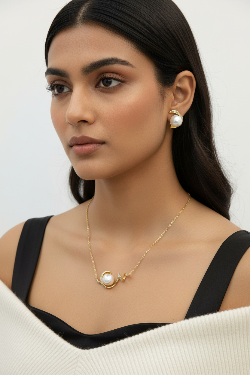 (Pearl Set): "Golden Eye" 18K Gold-Plated Pearl Necklace and Stud Earring Set