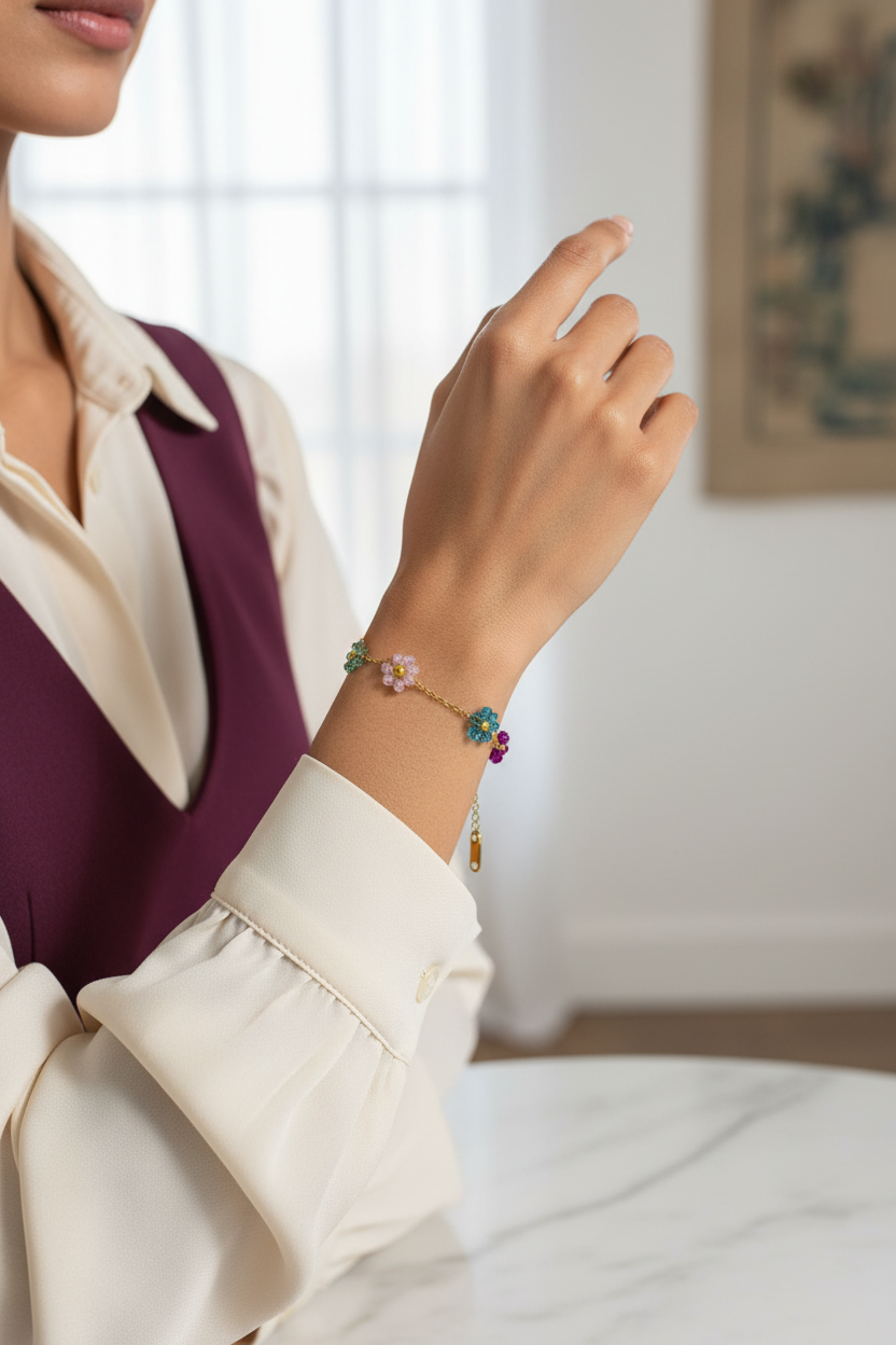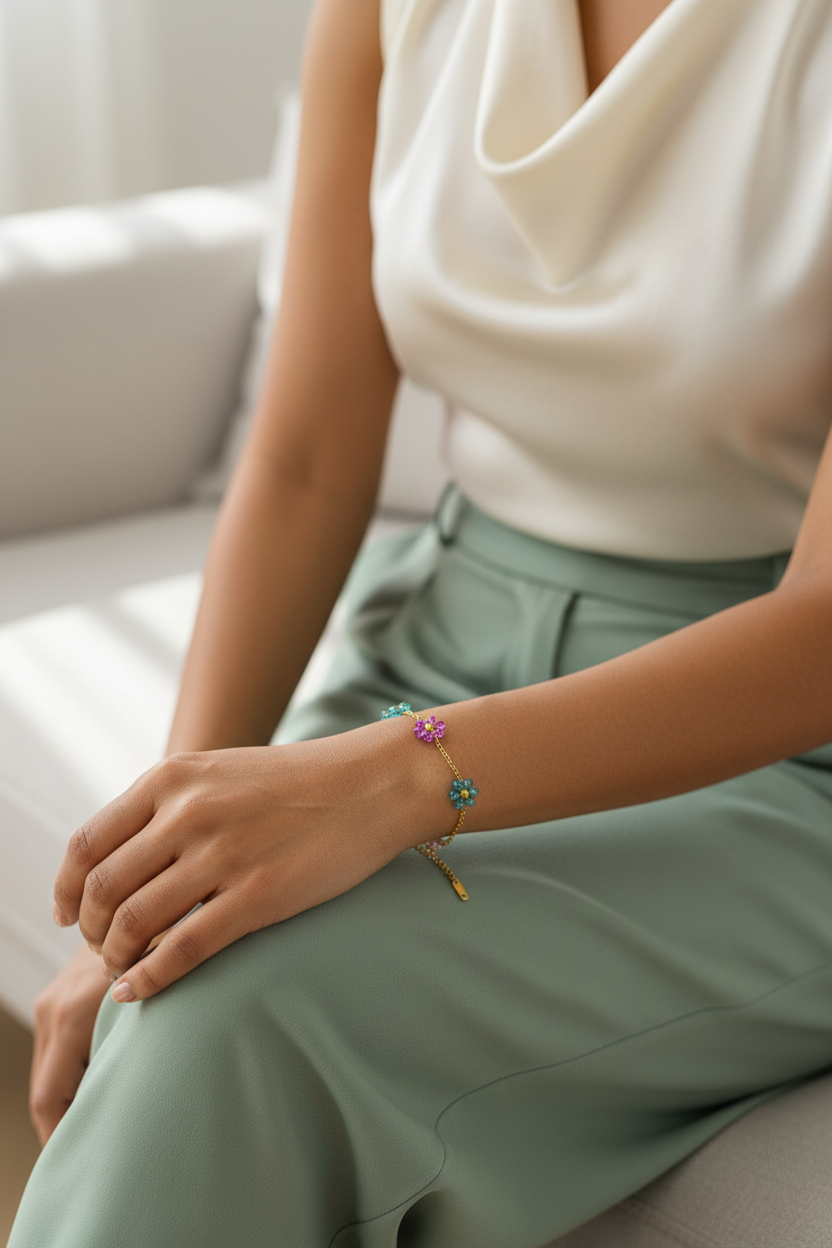 Beaded Flower Bracelet Handcrafted Multi-Color Crystal Flower Charm Bracelet – Gold Tone Chain with Vibrant Beaded Petals