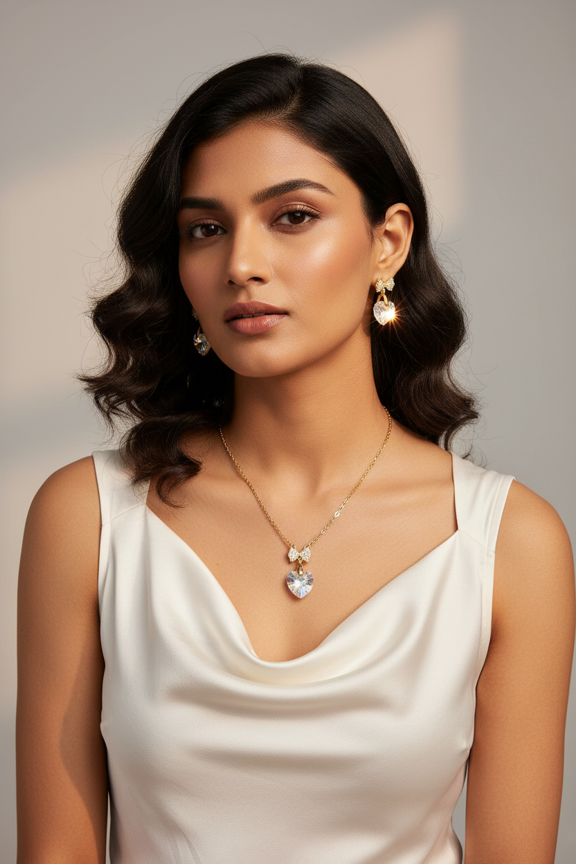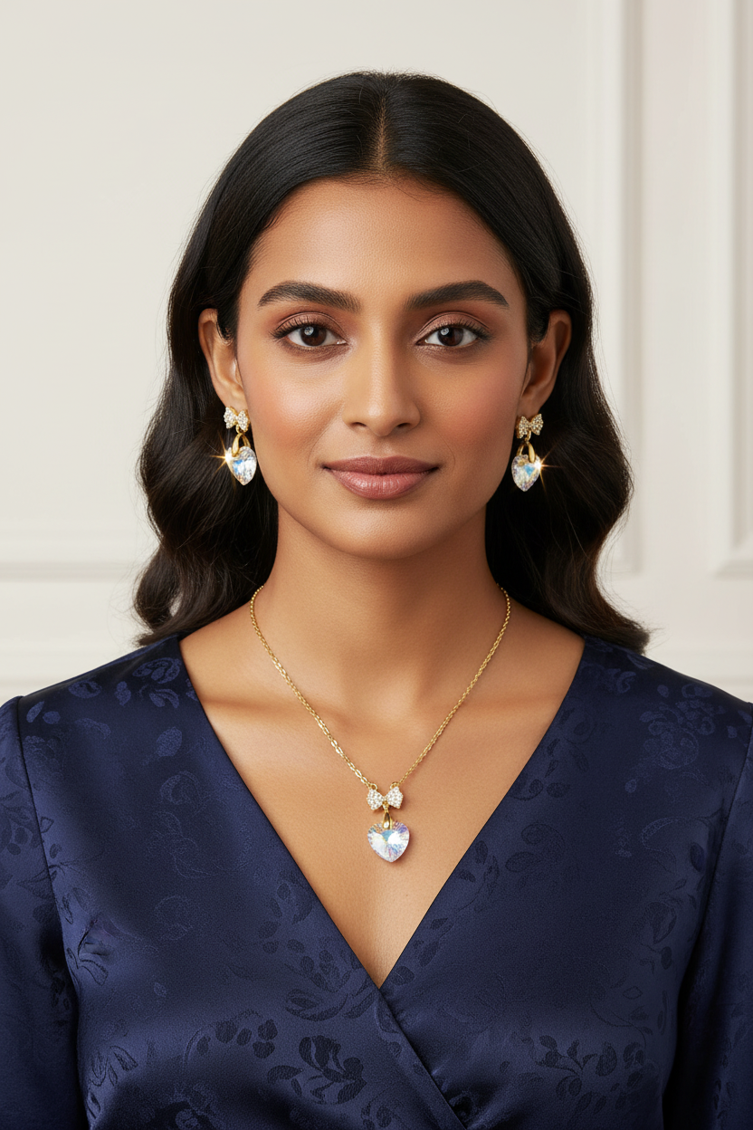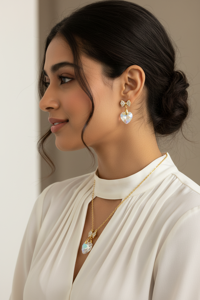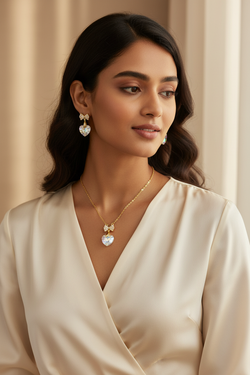 Romantic Shimmering Crystal Heart Pendant with Bow Accents/Sweetheart Bow & Holographic Crystal Drop Earring and Necklace Set