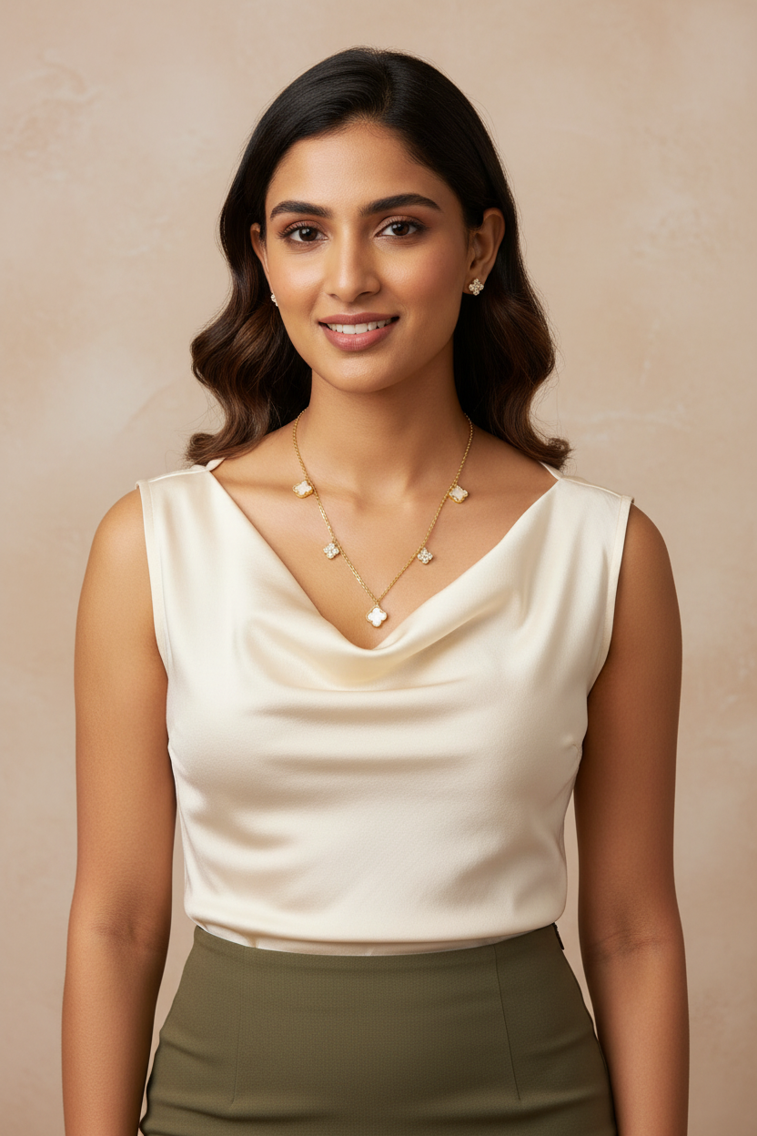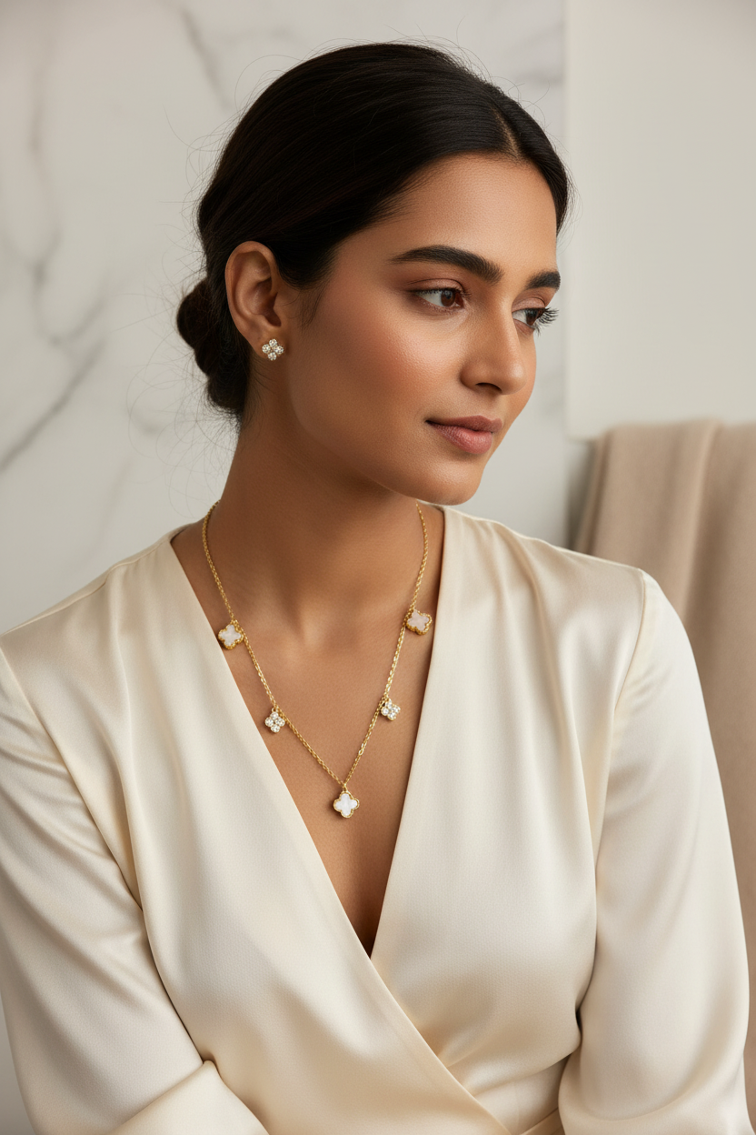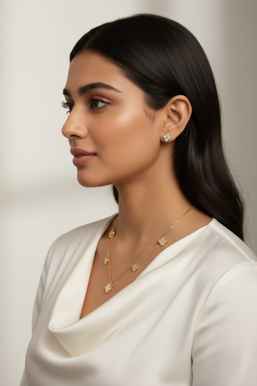 Lucky Clover Station Necklace and Matching Studs with White Inlay