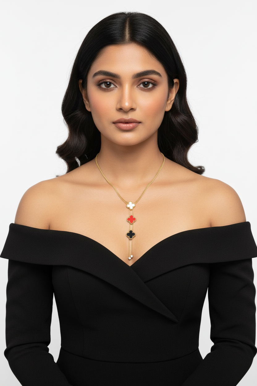 A Vibrant Twist on a Classic Symbol Elevate your accessory game with our Multi-Color Clover Charm Necklace. This playful yet sophisticated piece features three beautifully crafted clover motifs in a striking palette of pearl white, bold red, and classic black enamel. Suspended from a delicate gold-tone chain and finished with two shimmering crystal drops, it's designed to bring a touch of luck and luxury to any outfit.