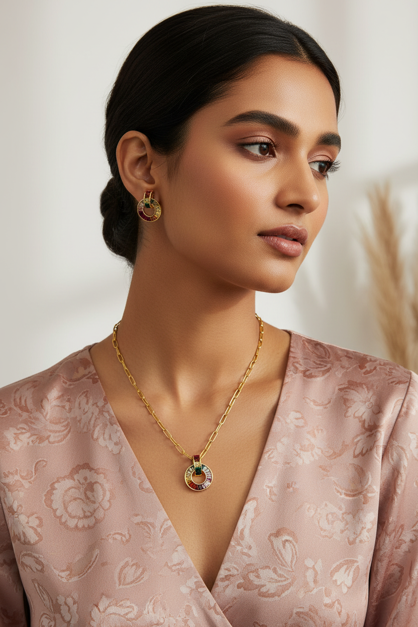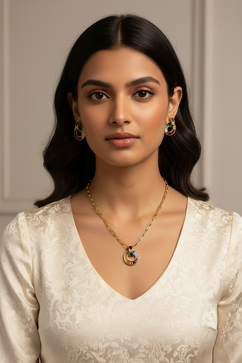 Bohemian Rainbow Crystal Necklace & Studs with Dual-Link Chain